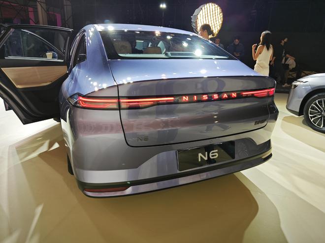 尾部设计呼应N7,贯穿式尾灯中央嵌入发光 “NISSAN” 标识,配合小鸭尾和隐藏式排气,视觉层次感突出。