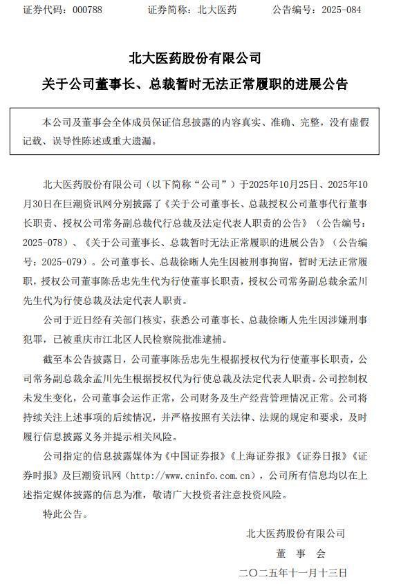 11月12日,北大医药发布公告称,公司于近日经有关部门核实,获悉公司董事长、总裁徐晰人因涉嫌刑事犯罪,已被重庆市江北区人民检察院批准逮捕。