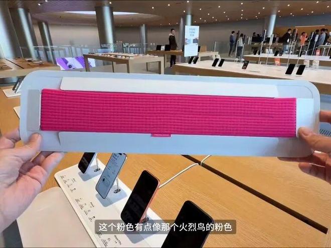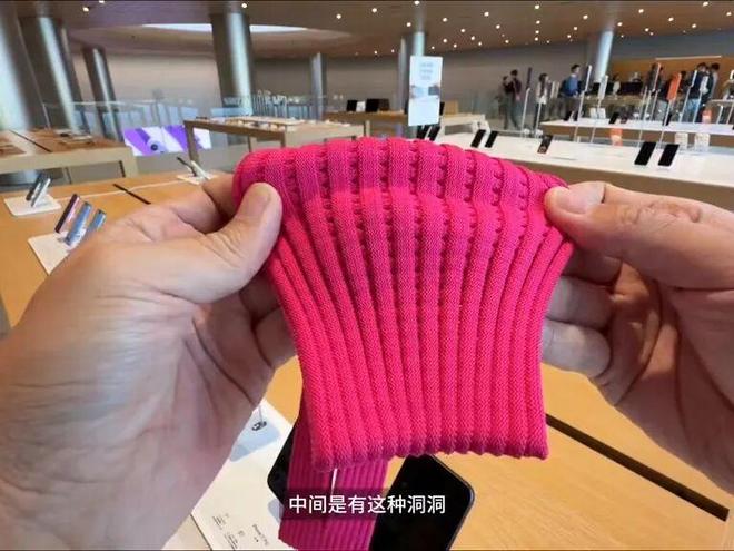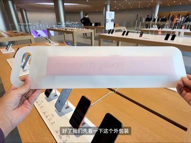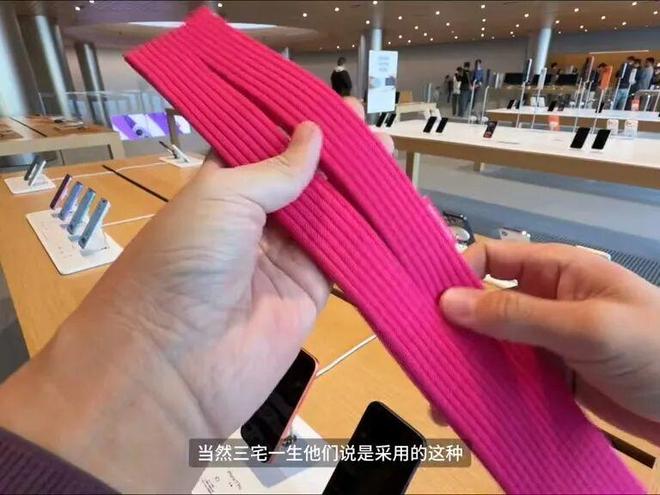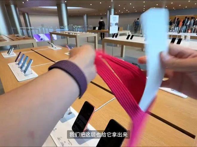 这名博主购买的粉色款,可以看到撕掉外包装后,iPhone Pocket是套在一张白色衬纸上,还需要取出才能使用。![]()