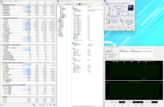 可以看到单烤CPU时,Intel酷睿Ultra 5 处理器225F在烤机初期性能释放高达91.5W,之后稳定在65W左右,温度控制在74度左右。