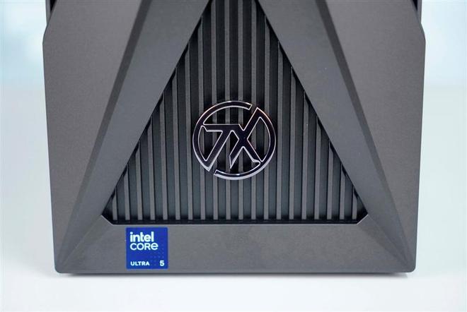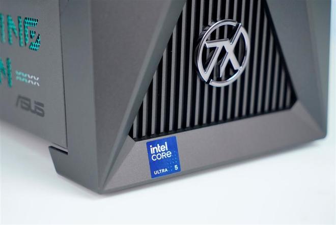 华硕天选6X台式机前面板底部贴有英特尔酷睿Ultra 5处理器贴纸。