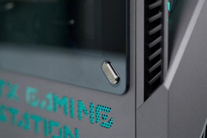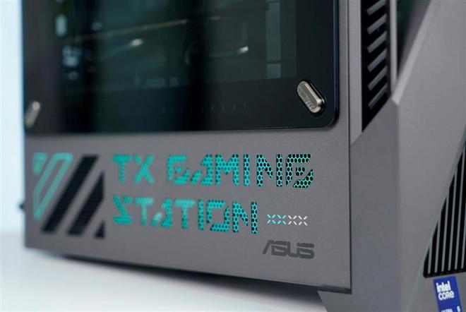 华硕天选6X台式机侧面板并非全玻璃设计,而是通过四角四个金属装饰钉,将玻璃固定在金属面板边框上,提升了结构强度,长途运输也更加安全。