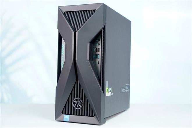 华硕天选6X台式机采用了深色机箱设计,正面机甲风格"X"型结构立体感十足,将机箱正面面板分成上下左右四块,简洁硬朗。
