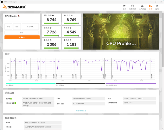 在3Dmark CPU基准测试中,华硕天选6X的单线程成绩为1181,最大线程成绩为8744。