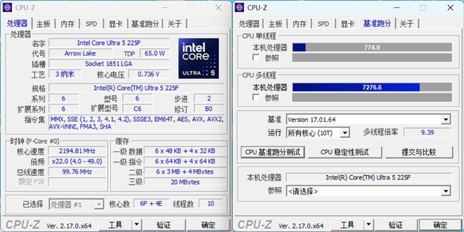 华硕天选6X台式机搭载了Intel酷睿Ultra 5 处理器225F,在CPU-Z的基准测试中,CPU单线程成绩为774.9,多线程成绩为7276.6。