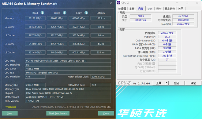 我们使用AIDA64进行内存测试,华硕天选6X台式机搭载的32GB DDR 5内存读取、写入、复制带宽分别为59121MB/s、67645MB/s、65960MB/s,延迟为138.4ns。
