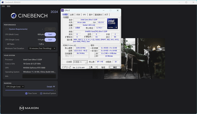 CineBench 2024测试中,单核成绩为114pts,多核成绩为828pts。