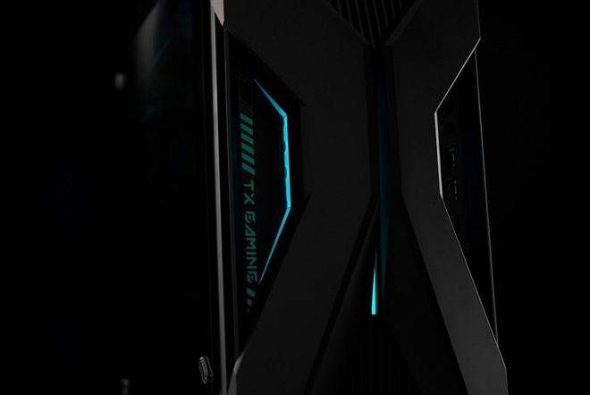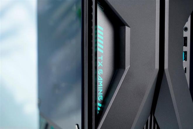 前面板中央的"X"型结构两侧隐藏的导光材料,可以把两侧的"TX GAMING"字样和扩展接口照亮。