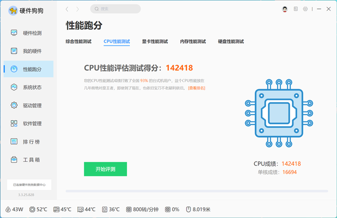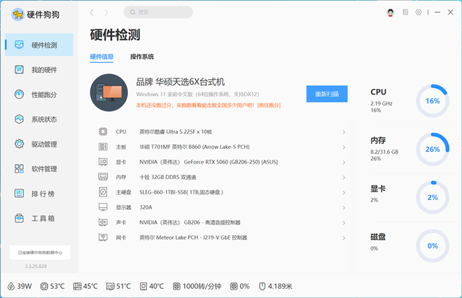 华硕天选6X台式机在硬件狗狗中的性能测试中跑出了629745分,超越全国96%的台式机用户,其中CPU分数为142418,同样超过了93%的台式机用户。