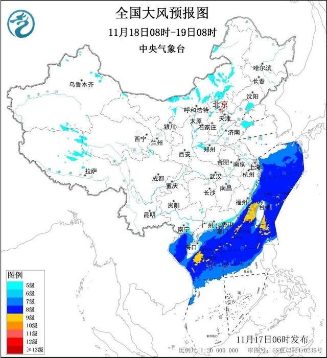 11月18日08时至19日08时,内蒙古中东部、华北北部、辽东半岛、山东半岛、浙闽东部沿海、华南南部等地的部分地区有5~6级风、阵风7~8级的大风;东海大部海域、台湾海峡、台湾以东洋面、巴士海峡、南海北部和中部海域、北部湾将有7~8级、阵风9~10级的大风,其中台湾海峡、台湾以东洋面、巴士海峡、南海中西部的部分海域风力可达9~10级、阵风11~12级。