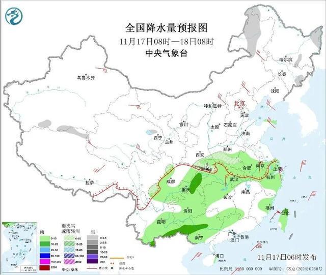 预计11月17日至18日,黑龙江东北部、陕西南部、四川盆地东部、重庆、贵州、江汉大部、云南东部、江南、华南等地日平均或最低气温下降6~10℃,其中,重庆北部和东部、湖北西部、贵州北部和东部、江淮东部、江南北部、广西东部等地的部分地区降温10~12℃,安徽南部局地降温可超过14℃。19日凌晨,最低温度0℃线将南压到苏皖南部至湖北中部一带。