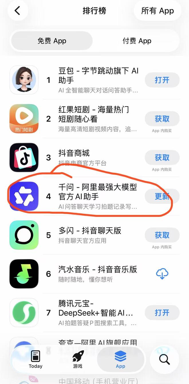三言发现,阿里旗下的AI助手应用“千问”已登上苹果App Store免费榜第四。此外,前五名中其他应用均为字节跳动旗下产品,分别为豆包、红果短剧、抖音商城、多闪。
