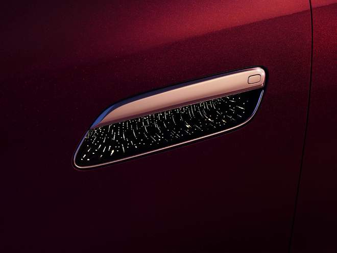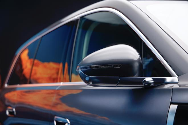 车身侧面线条流畅优雅,主打稳重内敛。饱满平滑的型面可以较好的满足家庭和商务需求。细节方面,车身采用了半隐藏式门把手,可以实现电动开合与物理开启方式,兼顾风阻、便利性及安全性。
