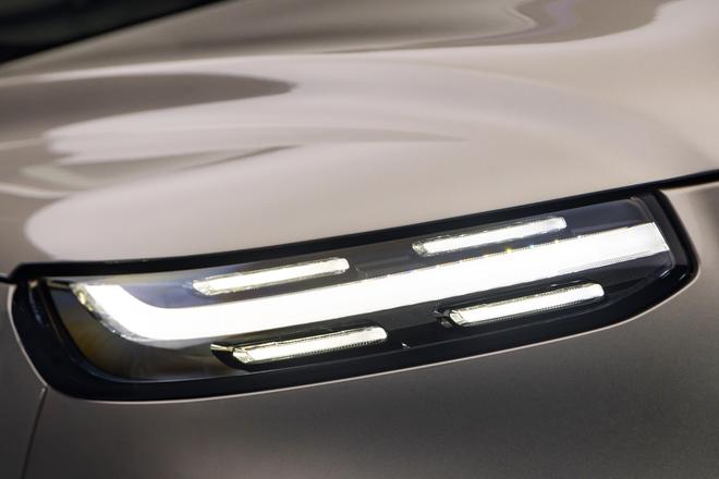 前灯组采用分体式设计。上方LED日行灯与格栅中的贯穿灯带连为一体,拔高了整个车头的视觉中心,而主大灯则低调的布置在两侧的格栅中。不过,前大灯组带有投影功能,可以对对面投射出光毯效果,进一步方便日常驾驶。