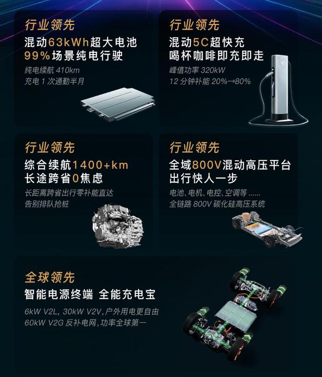 该车搭载了800V智能超混平台,标配65度三元锂电池,并支持5C快充,20%-80%充电时间仅需12分钟,CLTC纯电续航350km,综合续航超过1400km。