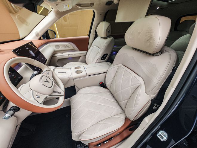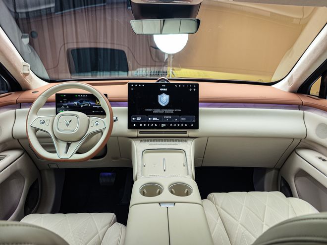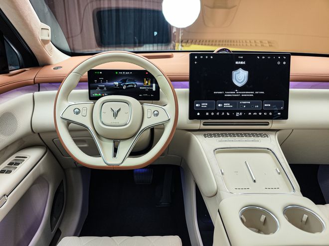内饰设计稳重柔美,山海万象的设计理念,采用T字型的中控布局,搭配细节柔美的造型,营造出颇具东方美学的内饰风格。配色方面,该车拥有玄红、暖棕、云米三种配色。车内软包采用悬浮设计,软质包覆率超90%。90.8%的3Dmesh与麂皮绒,触感细腻。