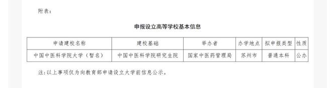 根据《中华人民共和国高等教育法》《普通本科学校设置暂行规定》等有关法律法规,经组织专家指导、考察、评议,拟按程序向教育部申报设立中国中医科学院大学(暂名),现予以公示。公示时间为2025年11月20日至11月26日。