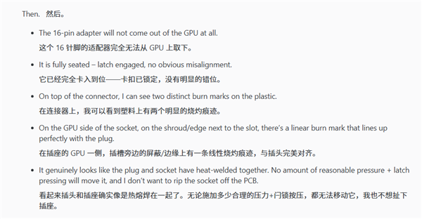 最关键的是该用户尝试之后,却完全无法从GPU接口上拔下,这表明连接器可能因为高温熔化而与电源接口"粘合"在一起,成为一个整体。