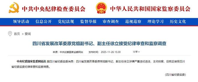 中央纪委国家监委网站11月26日通报,据四川省纪委监委消息:四川省发展改革委原党组副书记、副主任徐立涉嫌严重违纪违法,主动投案,目前正接受四川省纪委监委纪律审查和监察调查。