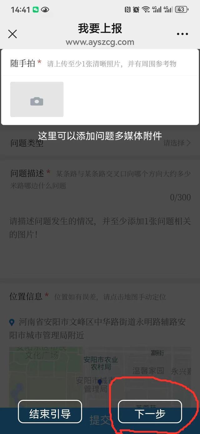 第六步:按照提示信息录入反映的城市管理问题描述、具体位置及相关图片,也可以点击地图位置定位。点击“下一步”。