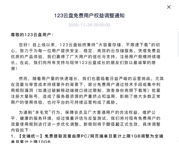打击羊毛党,123云盘调整免费用户权益引发关注