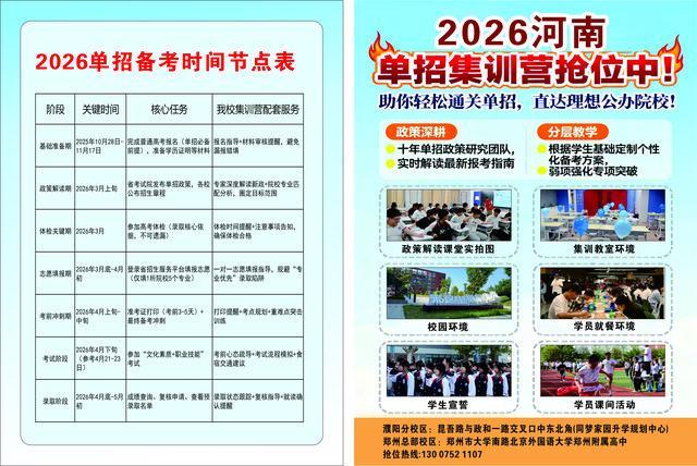 目前,2026年河南单招备考已进入关键阶段,同梦家园濮阳、郑州双校区集训营各班次名额火热递减中。依托双校区地域覆盖优势与成熟教学体系,机构将以专业的教学团队、精准的政策对接、完善的升学服务,助力每一位考生把握政策红利,在单招竞争中脱颖而出。