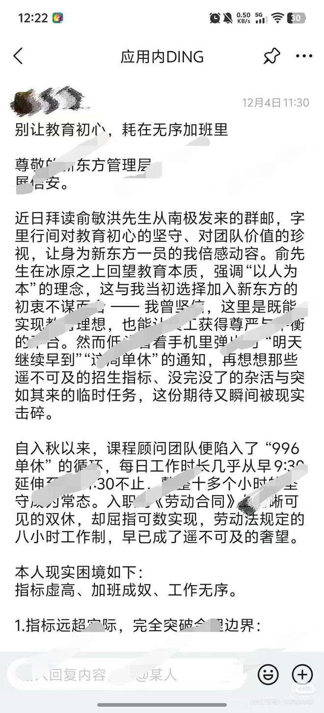 12月4日,网传一名新东方员工在内部邮件中表达了对公司加班文化的不满,呼吁管理层尊重员工的基本劳动权益。