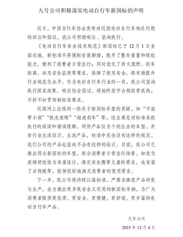 12月5日消息,九号公司发布了《积极落实电动自行车新国标声明》: