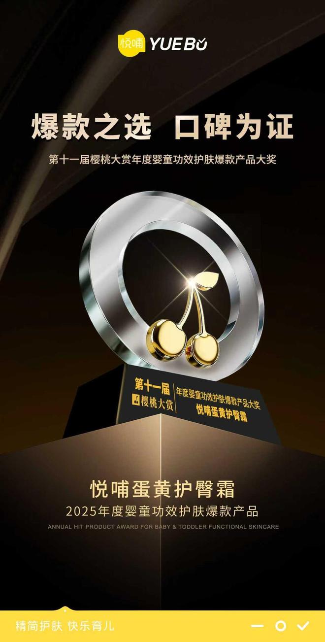 悦哺品牌王牌产品——悦哺蛋黄护臀霜,在近日由母婴行业观察举办的2025年度樱桃大赏中,成功荣获“年度婴童功效护肤爆款产品”大奖。