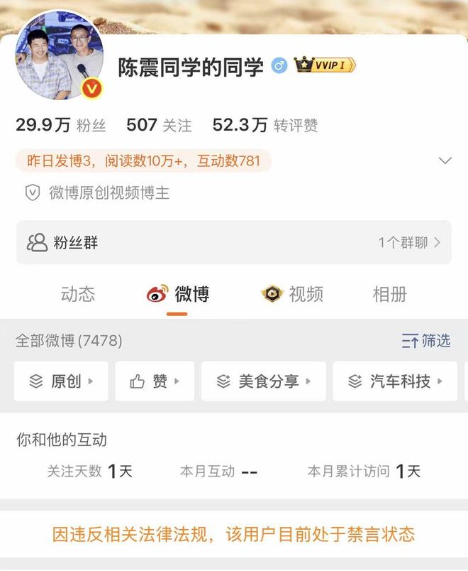 汽车博主陈震微博、抖音、B站、小红书等平台账号被禁言。今日,陈震通过小号回应:没啥可说的,检讨自己。不过目前该条回应已经被删除。