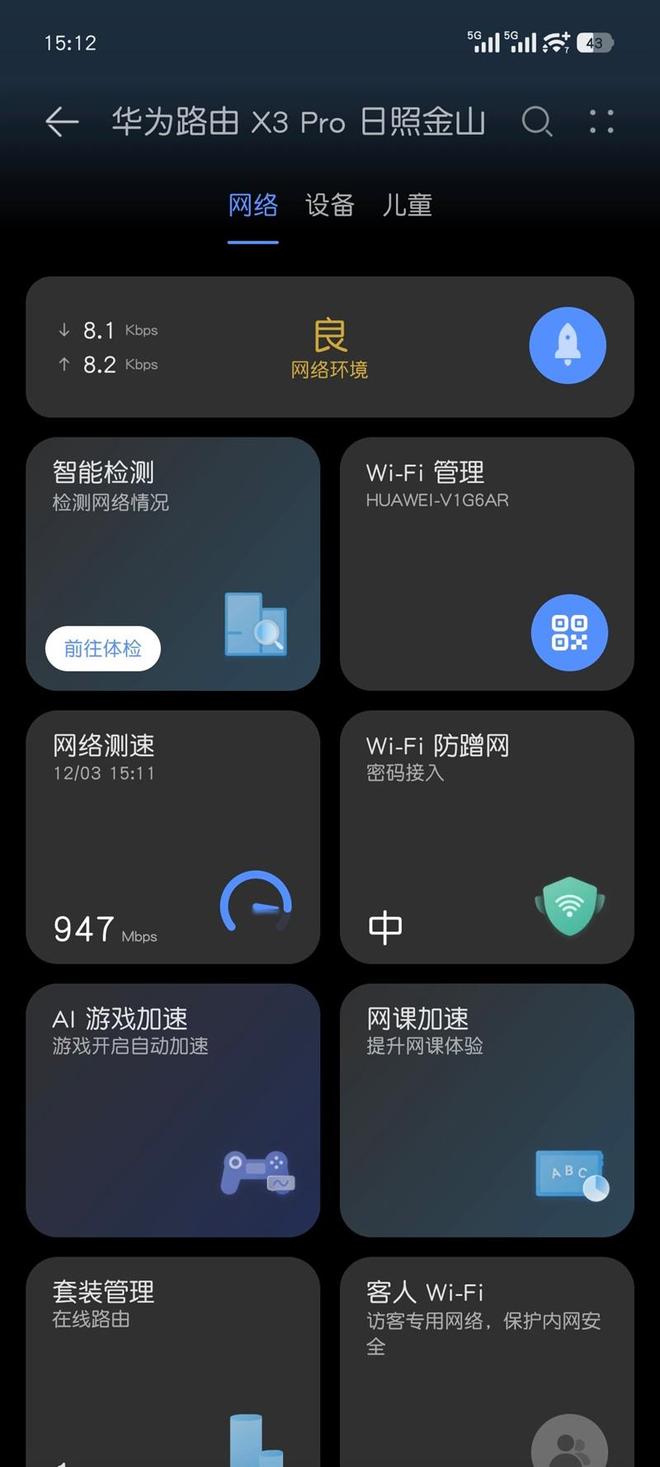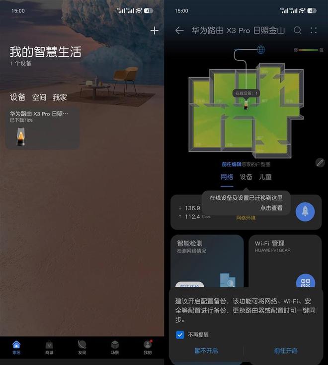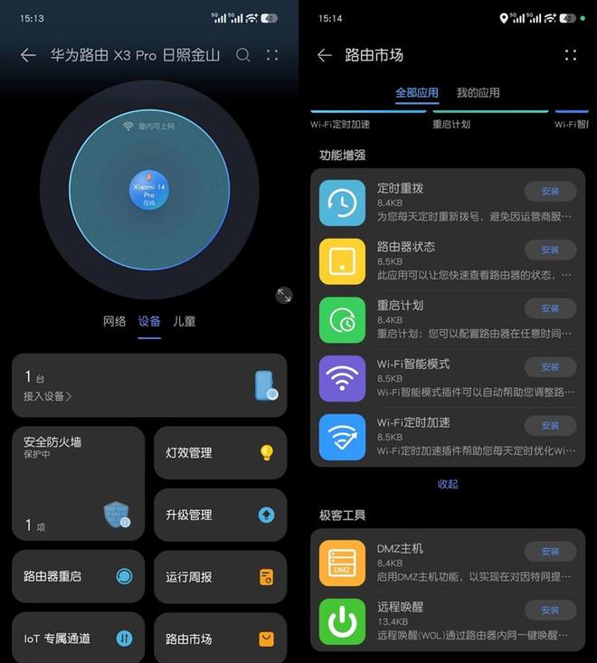 在智慧生活APP的设备页面中,用户可以对华为路由X3 Pro 日照金山本身进行功能设置,还可以在路由市场中,安装更多的APP扩展功能。