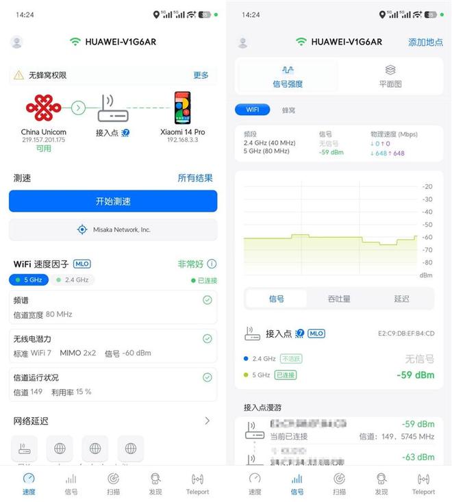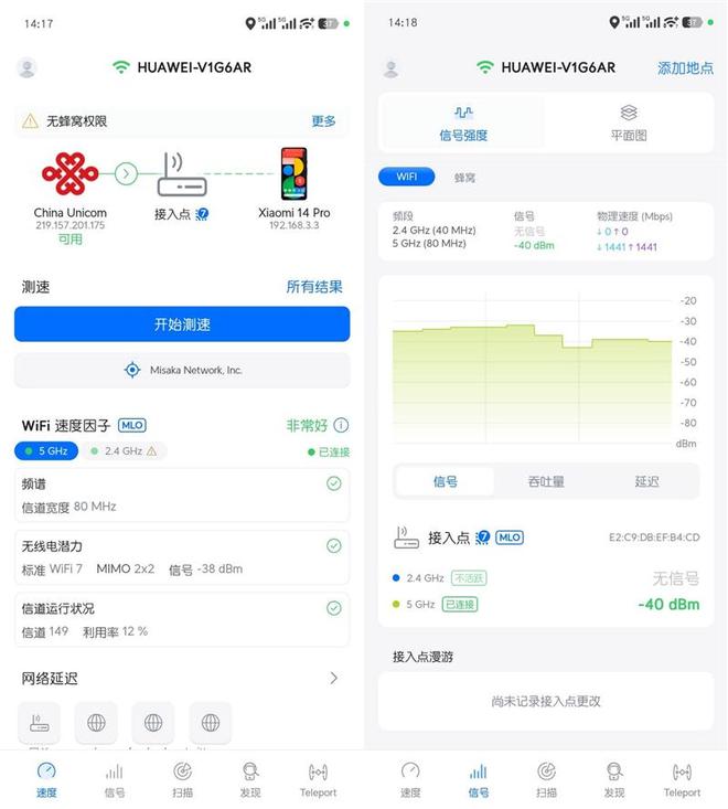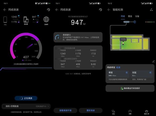 在近距离(约2米)位置使用手机进行测速,上面是华为智慧生活APP内置的测试工具,下方是第三方测速APP,注意由于不同工具选取的测速点,测试结果是会有一定的差距。第三方测速选取的测速点距离我们这里有300公里的距离,所以测试网路下降还是比较明显的。