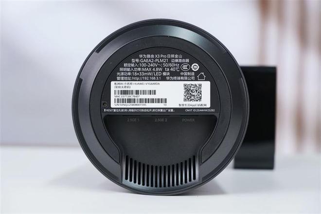 华为路由X3 Pro日照金山底部的贴纸上印有详细的产品规格,包括照明输入功率为4.8W@40度,以及光源功率为18x33mW/LED模块。