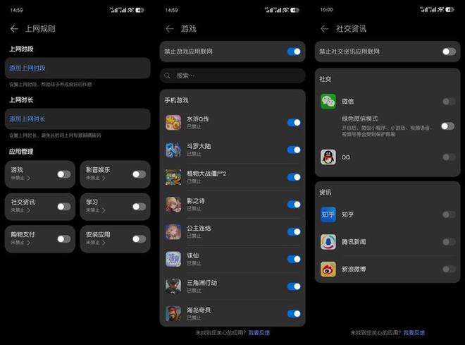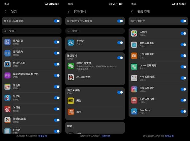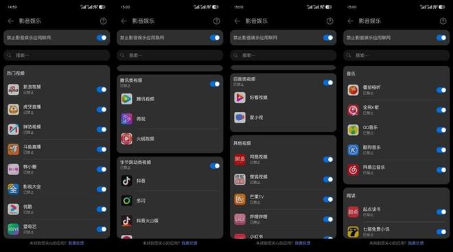 除了最基本的上网时间管理之外,华为路由X3 Pro 日照金山还可以对六大类APP的联网行为进行独立管理控制,一些手机游戏、聊天工具、各类视频软件甚至作业辅导工具和应用商店,都可以进行单独控制管理,非常方便。