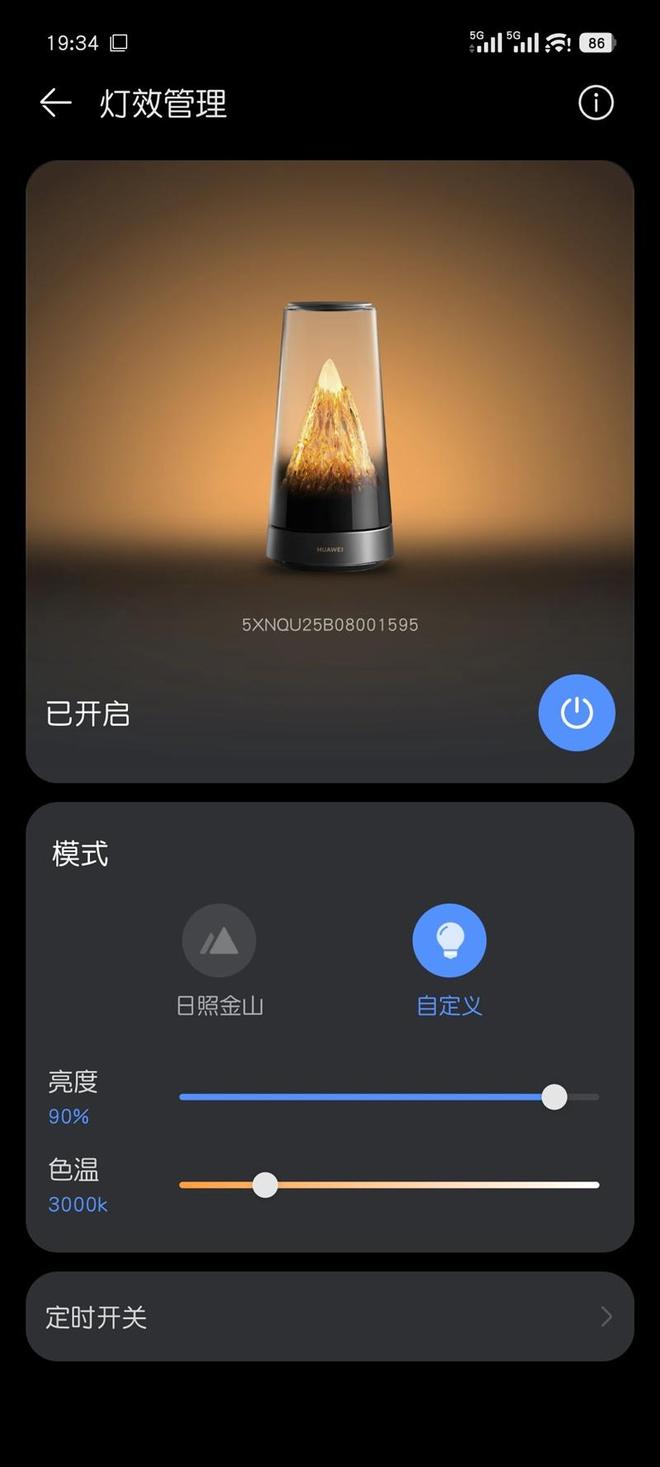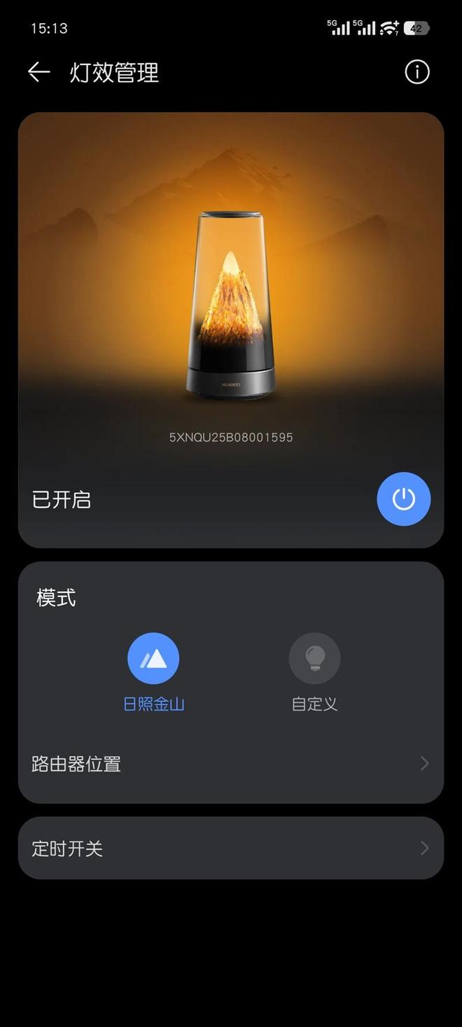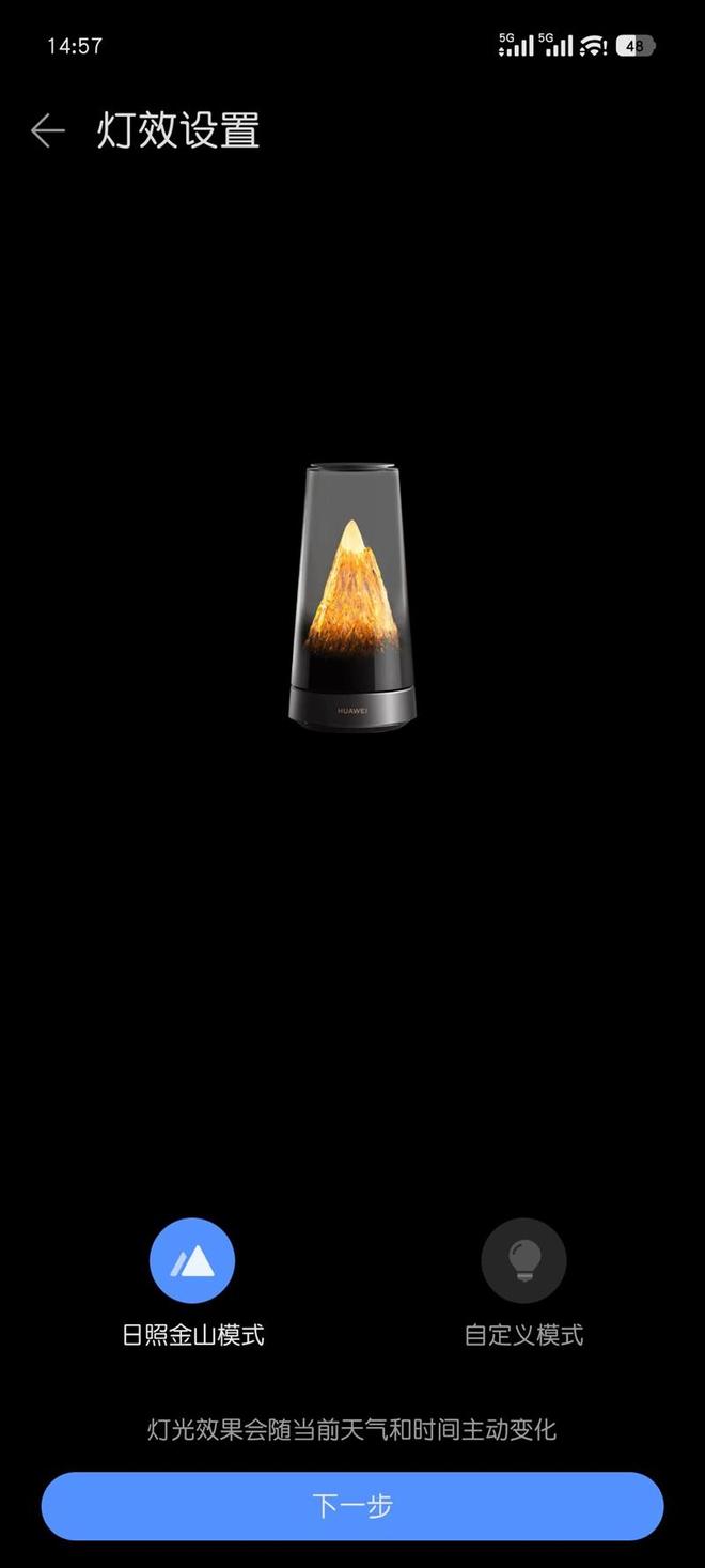 华为路由X3 Pro 日照金山首次连接华为智慧生活APP时,首先会让选择华为路由X3 Pro 日照金山的灯光模式,可以选择日照金山模式,每天会根据时间自动改变光线,也可以选择自定义模式,手动指定亮度和色温。