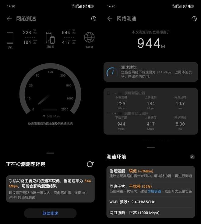 可以看到华为智慧生活APP中的速测工具会直接提示距离过大连接速率下降,虽然信号强度降低至-78dBm,干扰也较为明显,但测速时依然可以达到下载223Mbps、上传184Mbps的速度。