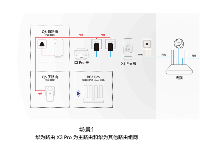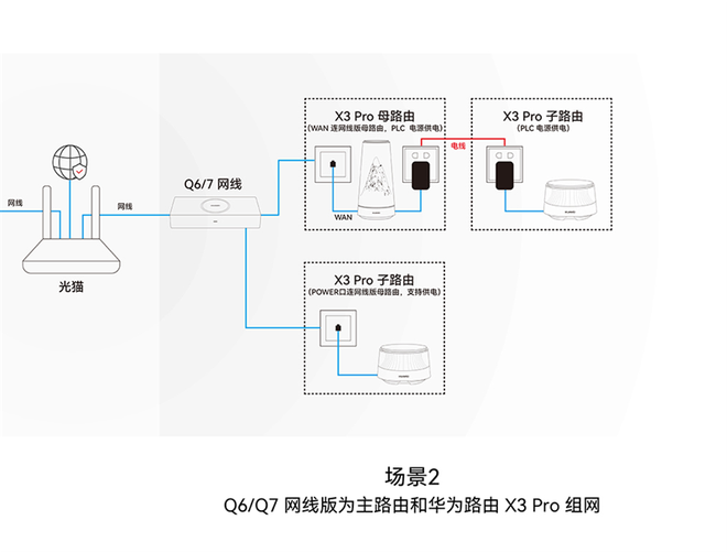 华为X3 Pro母路由也可以连接在Q6或Q7下级,并通过PLC适配器继续通过电力线路扩展网络。