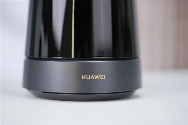 华为路由X3 Pro日照金山的深灰色底座,正面印有金色的华为Logo。