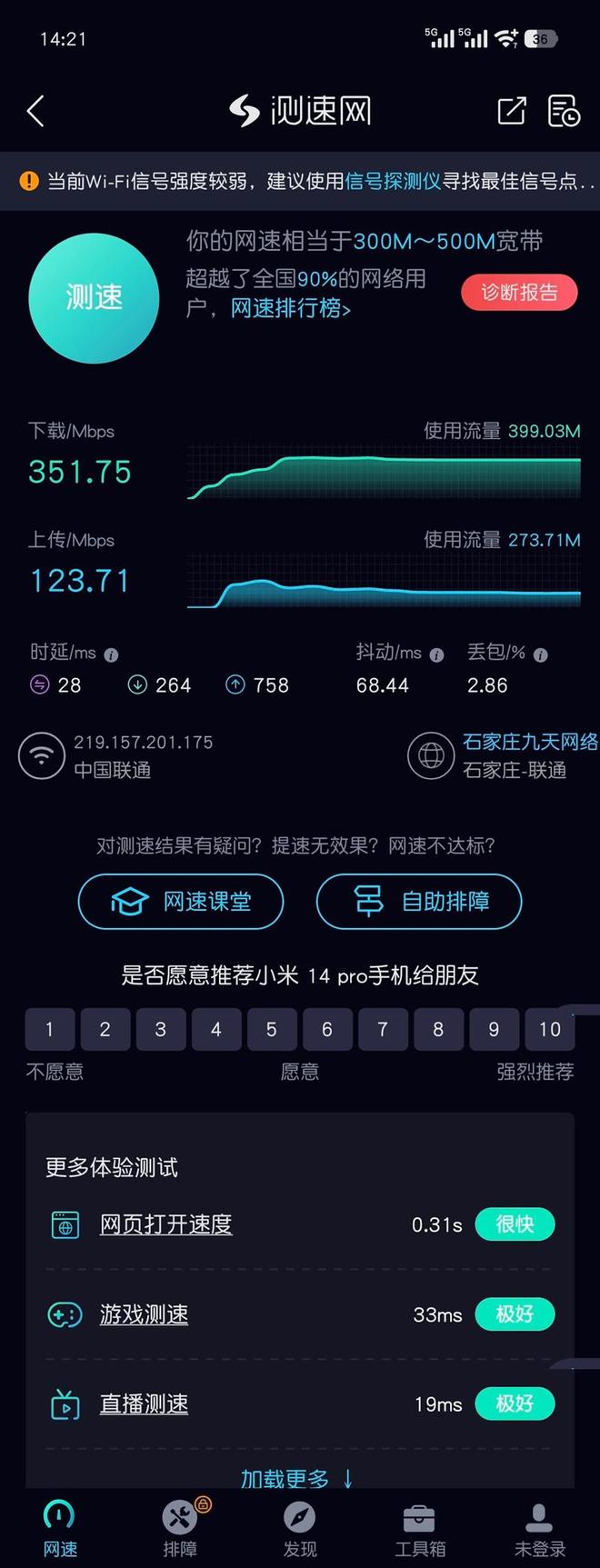 第三方测速工具也会提示当前Wi-Fi信号强度较弱,建议到信号更好的位置进行测速。实测速度也有所降低,但仍有超过300Mbps的下行,另外网页打开速度、游戏测速和直播测速的变化都不明显,虽然距离增大导致网速下降,但华为路由X3 Pro 日照金山的网络延迟并没有明显增长。
