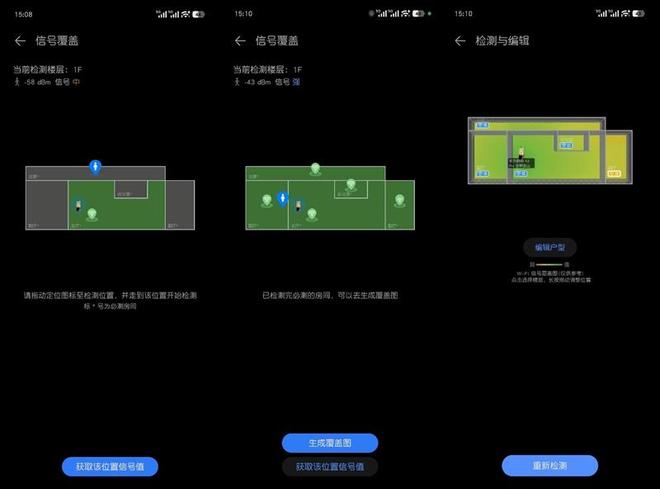 我们在智慧生活APP中,重新绘制了我们办公室的平面图,并根据APP中的提示,在各个测量点测量信号强度,可以获得整个房间的信号热力图。