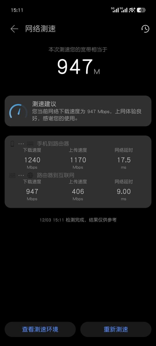 之后我们直接进行测速,由于我们公司内使用的光猫仍是千兆规格,所以并没能发挥出华为路由X3 Pro 日照金山2.5G有线网络的速度优势,但可以看到测速结果依旧能把千兆吃满,丝毫没有瓶颈。