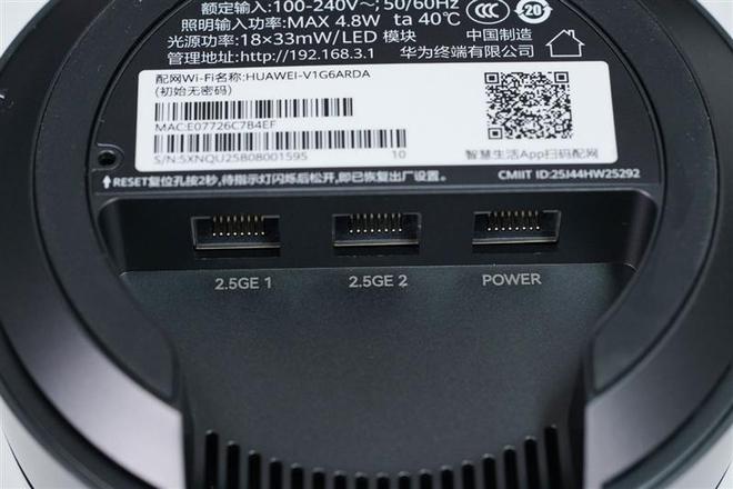 华为路由X3 Pro日照金山底部的接口部分特写,华为路由X3 Pro日照金山提供了两个2.5G有线网口和一个POWER接口,用于连接附带的PLC适配器进行供电。