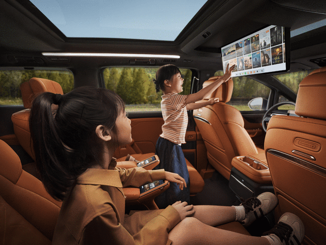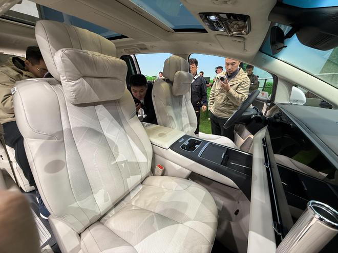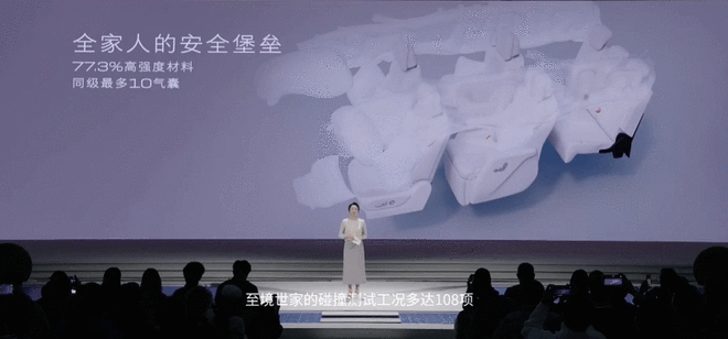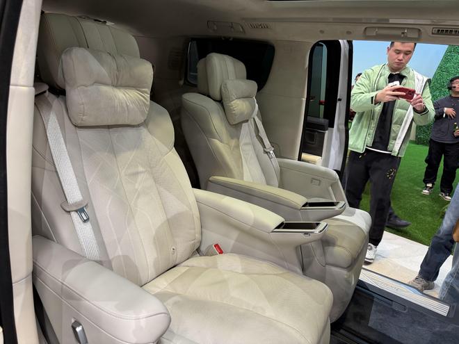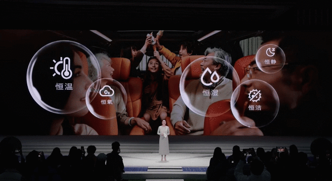 舒适性配置上,新车首创 “五恒”大健康座舱,实现恒温、恒湿、恒氧、恒洁、恒静的座舱环境。为了便于满足不同的需求,新车提供6座与7座两种座椅布局,二排多姿态零重力座椅支持自适应调节,还可联动副驾实现贵妃榻功能,配备 10 点式指压按摩、通风加热等功能;同时,第二排两侧电动滑移门支持手势控制,配合云台式超低礼宾空悬,大幅提升上下车的仪式感与乘坐平顺性。而第三排座椅支持电动前后滑移与翻折,后备厢容积可从 630L 拓展至 2056L,既能容纳露营装备、婴儿车等大件物品,也能满足多人长途出行的储物需求。