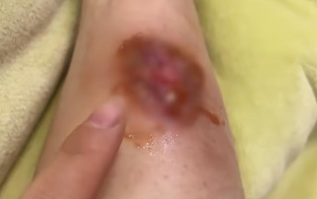 2023年12月,江苏无锡,一女子贴着暖宝宝睡觉,结果腿上被烫出了大水疱,创口明显。