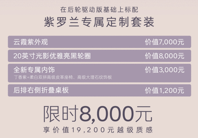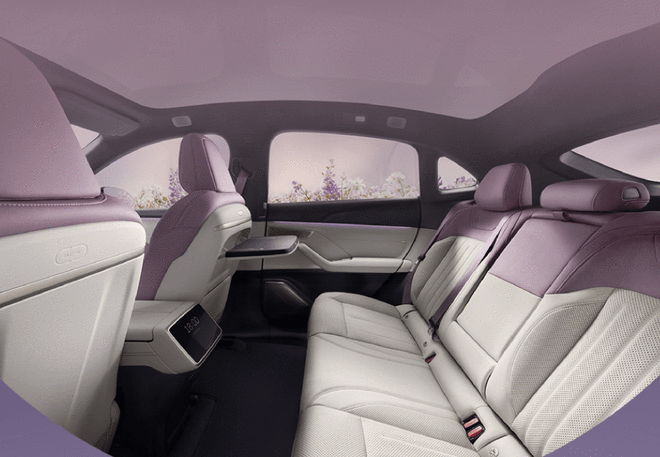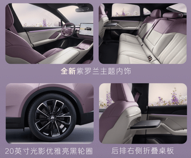 和黑骑士版一样,乐道L60紫罗兰限定版更多的是体现配色带来的新意,在整体设计上,其依然秉持乐道的Way Up蒸蒸日上的设计理念,同时拥有0.229Cd超低风阻。新车的设计灵感源自冬日紫罗兰,以融合季节氛围、色彩意象与情感温度为主,在后轮驱动版配置基础上,新车配上了云霞紫外观、20英寸光影优雅亮黑轮圈、后排右侧折叠桌板,以及由丁香紫+柔白双拼高级皮革座椅,搭配高级大理石纹饰板组成的全新专属内饰。