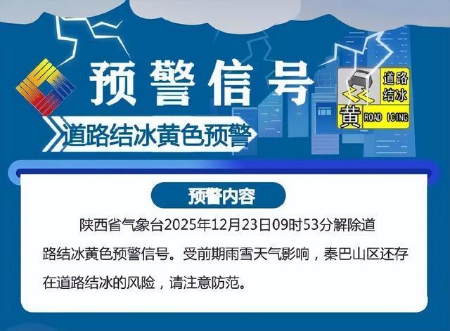 陕西省气象台2025年12月23日09时53分解除道路结冰黄色预警信号。受前期雨雪天气影响,秦巴山区还存在道路结冰的风险,请注意防范。