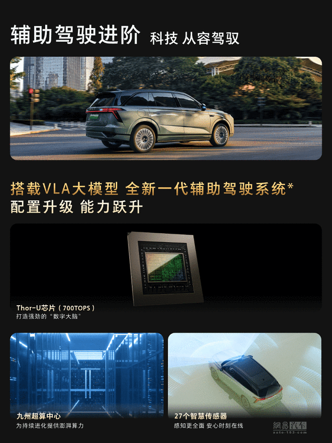 在硬件层面,全新蓝山智能进阶版搭载算力达700 TOPS的Thor-U芯片,并配备包括激光雷达在内的27个感知硬件,为VLA模型的实时运行提供算力与感知冗余支持。