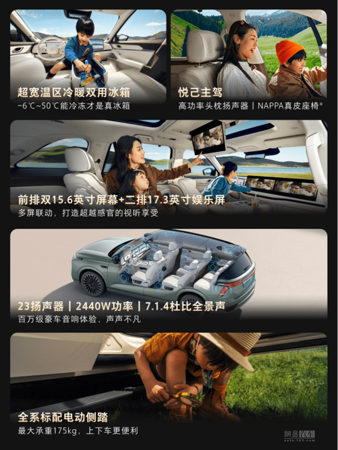 在舒适性配置方面,新车配备23扬声器音响系统、零重力副驾座椅、冷暖双用车载冰箱,并新增晕动舒缓显示等功能,针对家庭出行中常见的实际使用场景进行优化。