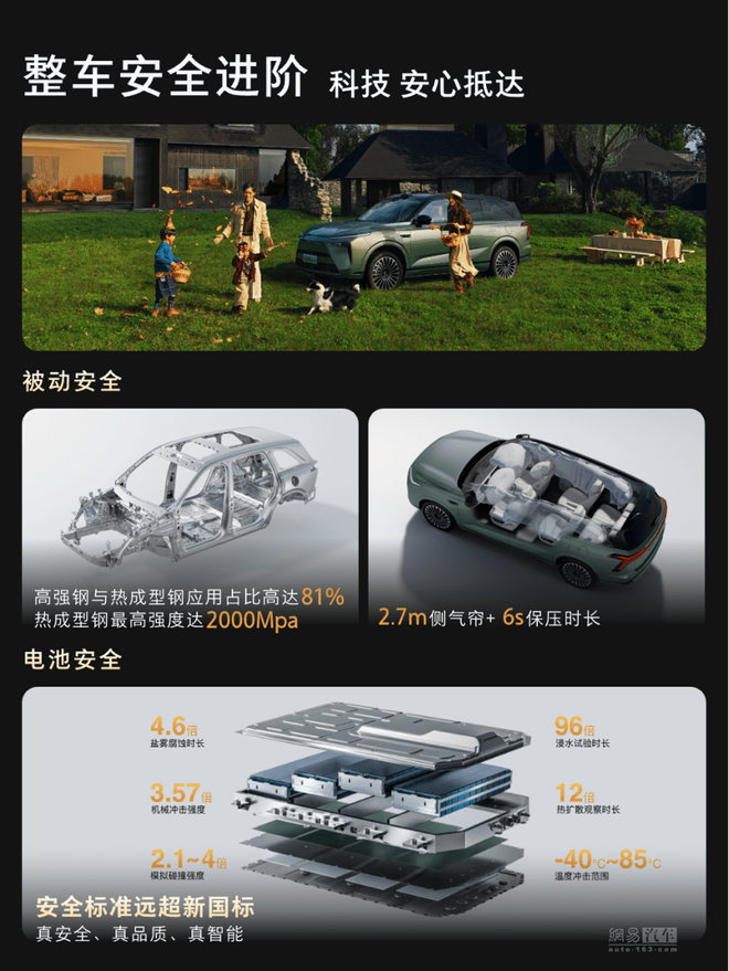安全方面,全新蓝山智能进阶版在结构与功能层面同步升级。车身高强钢与热成型钢应用比例达81%,关键部位材料强度最高达2000MPa。电池系统通过多项高于国标要求的安全测试,覆盖碰撞、挤压、浸水等极端工况。