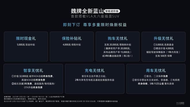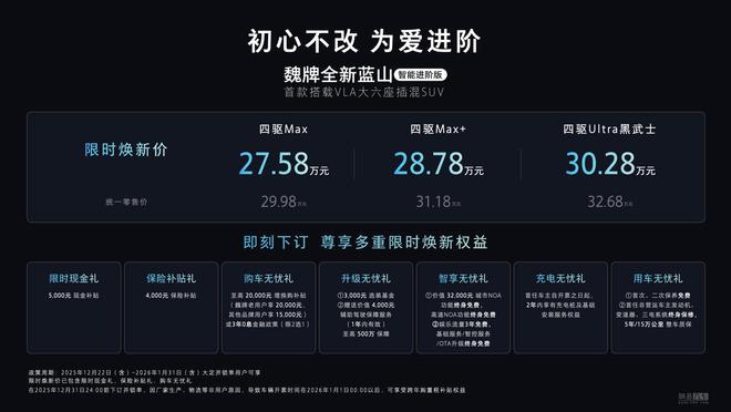 12月23日报道 昨晚,魏牌全新蓝山智能进阶版在保定·长城汽车技术中心正式上市,限时焕新价为27.58-30.28万元。做为“首款搭载VLA大模型的大六座插混SUV”,新车在智能辅助驾驶、动力系统、座舱体验与安全防护等方面迎来集中升级。